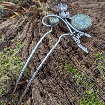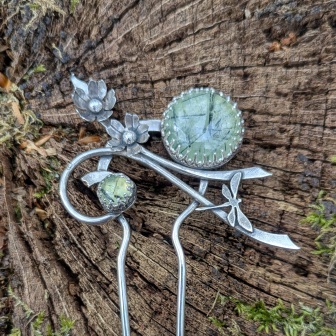 Porter cette pique à cheveux végétale avec une préhnite, c’est s’approprier un fragment de nature, un instant de poésie. C’est aussi affirmer une sensibilité, un lien intime avec le vivant et ses cycles.