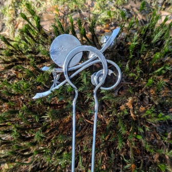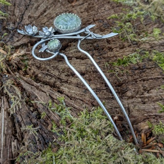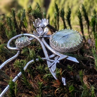 Pique à cheveux en argent 925 ornée de deux préhnites rondes, inspirée de la nature.