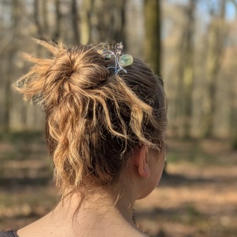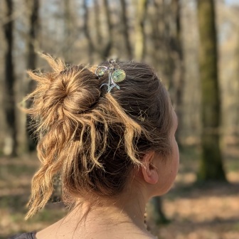 Dans le souffle doux du printemps, la pique à cheveux végétale avec une préhnite s’épanouit comme une promesse de renouveau. Issue de la collection capsule Aphaïa, elle incarne cette liberté fragile et lumineuse que l’on ressent lorsque la nature s’éveille, portée par le battement discret des ailes de papillons.